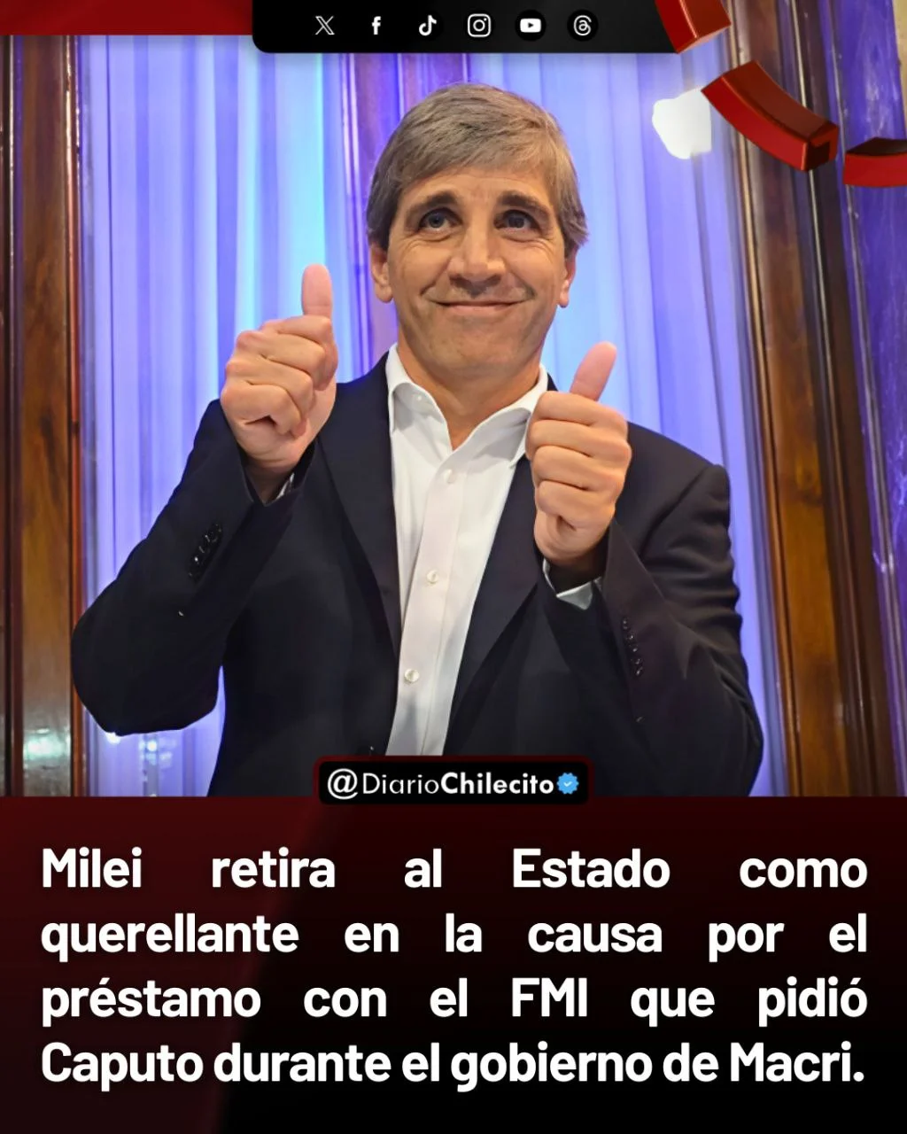 - Milei retira al Estado como querellante en la causa por el préstamo con el FMI que pidió Caputo durante el gobierno de Macri.