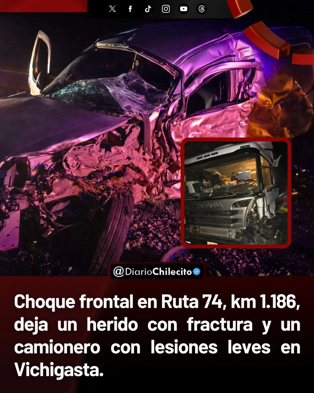 - Choque frontal en Ruta 74, km 1.186, deja un herido con fractura y un camionero con lesiones leves en Vichigasta.