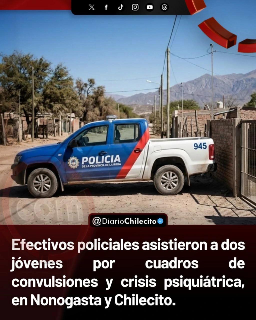 - Efectivos policiales asistieron a dos jóvenes por cuadros de convulsiones y crisis psiquiátrica, en Nonogasta y Chilecito.