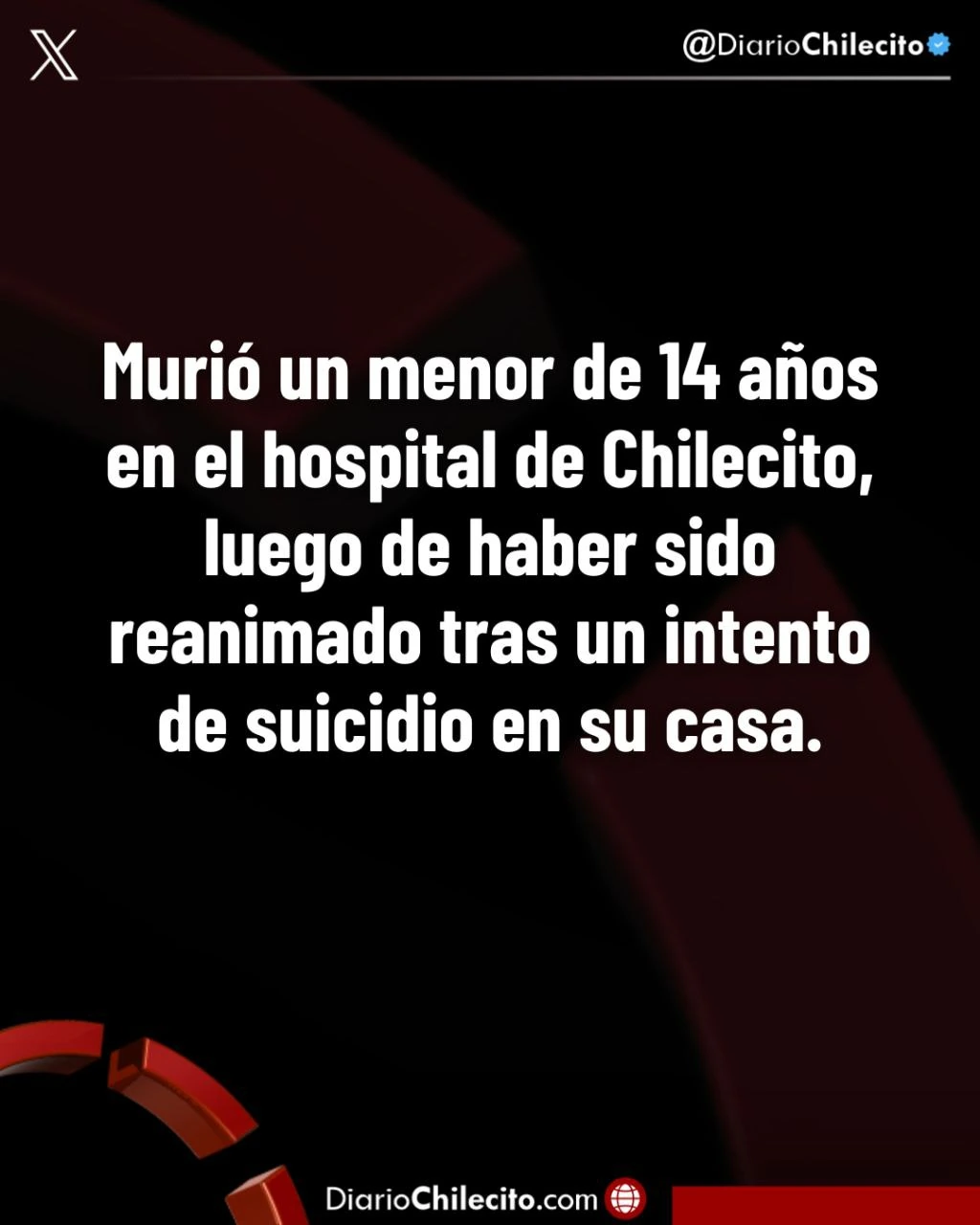 - Murió un menor de 14 años en el hospital de Chilecito, luego de haber sido reanimado tras un intento de suicidio en su casa.