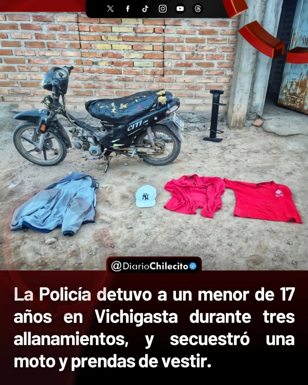 - La Policía detuvo a un menor de 17 años en Vichigasta durante tres allanamientos por una causa judicial, y secuestró una moto y prendas.