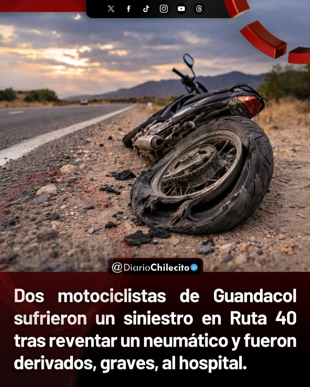 - Dos motociclistas de Guandacol sufrieron un siniestro en Ruta 40 tras reventar un neumático y fueron derivados, graves, al hospital.