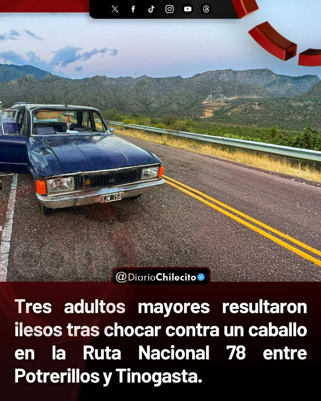 - Tres adultos mayores resultaron ilesos tras chocar contra un caballo en la Ruta Nacional 78 entre Potrerillos y Tinogasta.