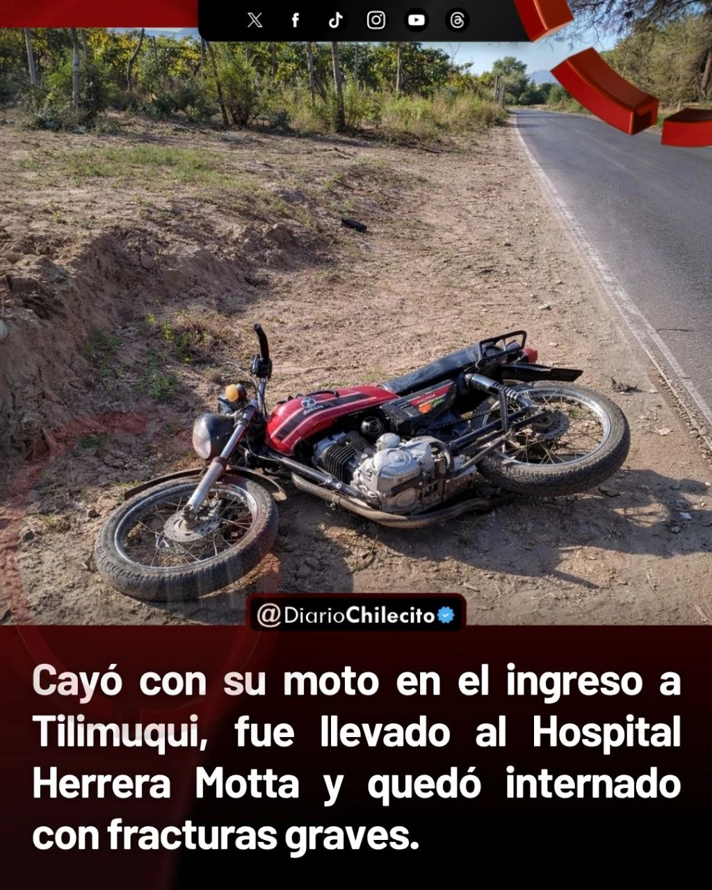 - Cayó con su moto en el ingreso a Tilimuqui, fue llevado al Hospital Herrera Motta y quedó internado con fracturas graves.