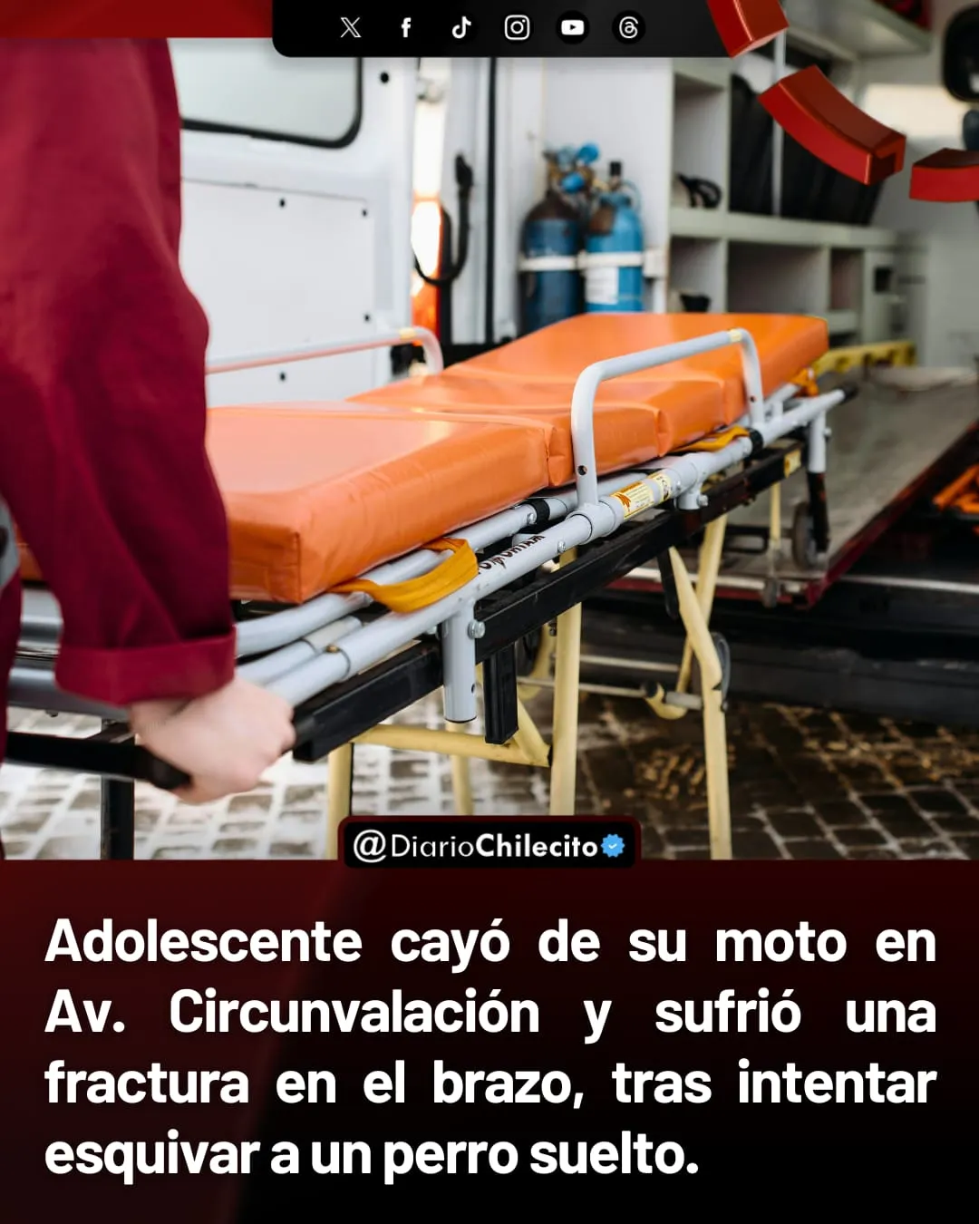 ● Un chico de 14 años cayó de su moto en la Avenida Circunvalación, a pocos metros de la estación YPF, y terminó con una fractura en el brazo izquierdo. El hecho ocurrió durante la tarde, cuando el joven circulaba acompañado por otro menor cuya identidad no fue confirmada.