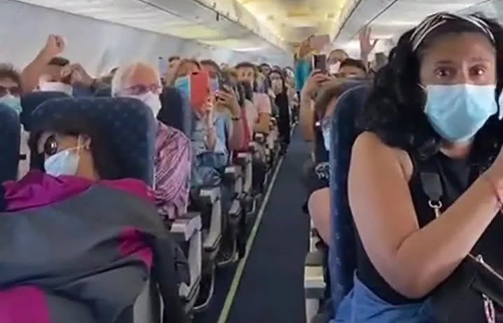 Los pasajeros estallan en gritos y festejos. Se abrazan unos con otros y continúan bajo la arenga “Dale campeón”.