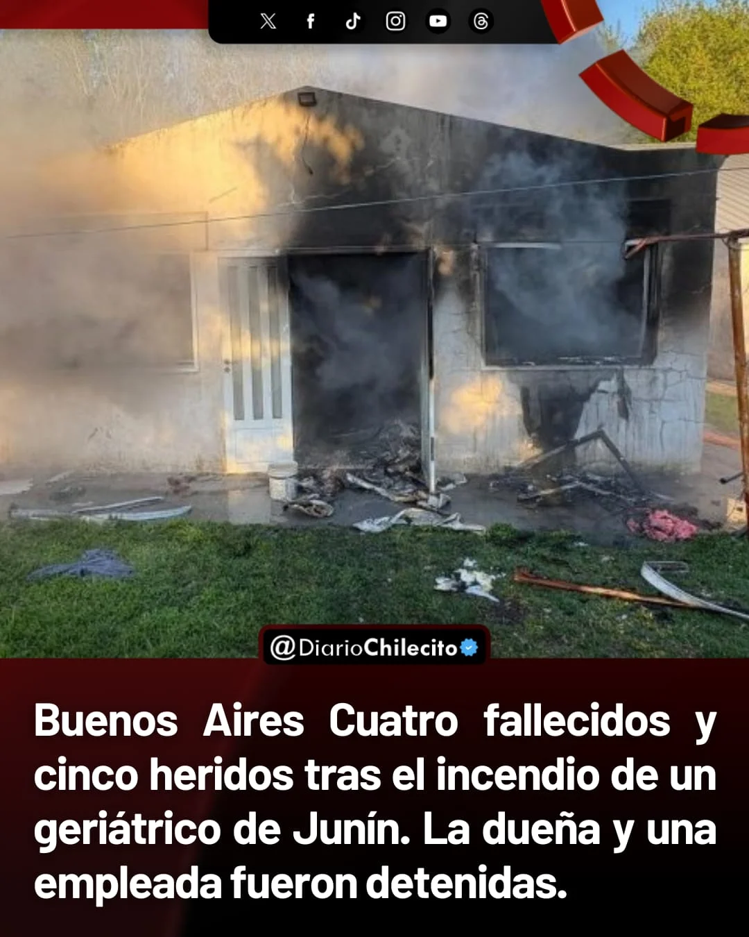 ● Un incendio arrasó el geriátrico “Nuevo Amanecer” en Junín, Buenos Aires. Cuatro personas murieron y cinco resultaron gravemente heridas, mientras que más de 20 fueron evacuadas. La situación generó conmoción entre las familias que esperan información de sus seres queridos.