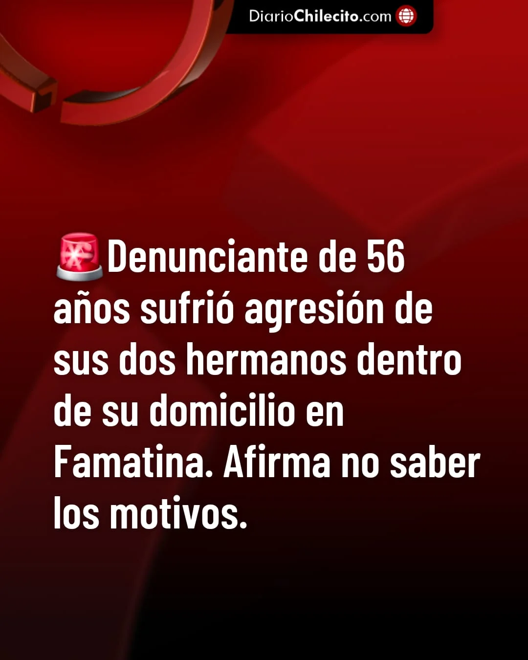 ● Un hombre de 56 años denunció que dos de sus hermanos lo agredieron físicamente dentro de su domicilio en la localidad de Famatina. El hecho ocurrió este lunes alrededor de las 13 horas.