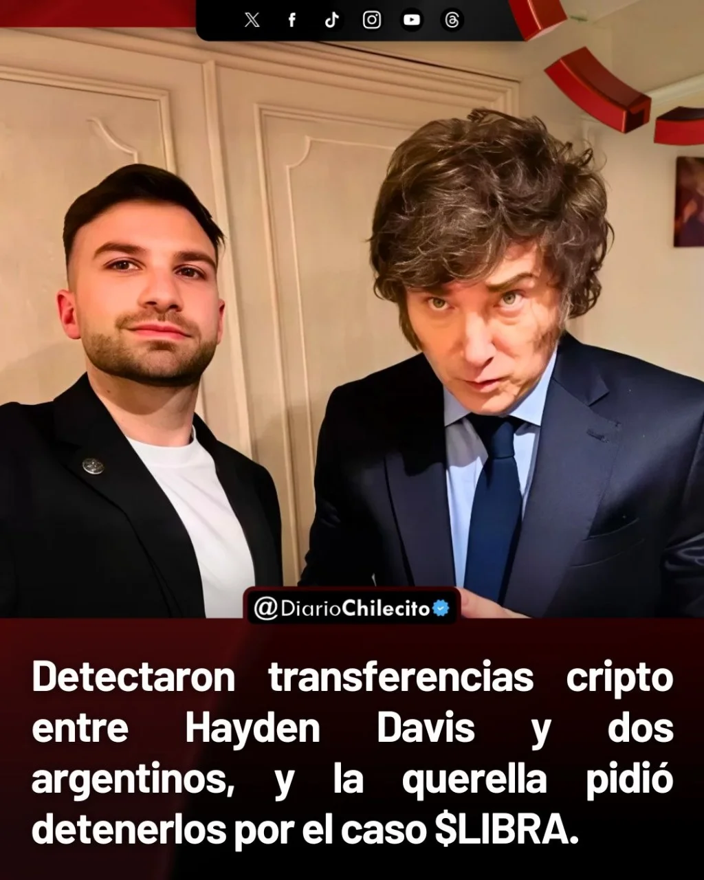 ● La querella del caso $LIBRA pidió detener a los argentinos Mauricio Novelli y Manuel Terrones Godoy, tras descubrir una “wallet” que los conecta con el empresario estadounidense Hayden Davis. El pedido fue presentado ante el juez Marcelo Martínez de Giorgi, en plena investigación por presunta estafa con la criptomoneda promocionada por Milei.