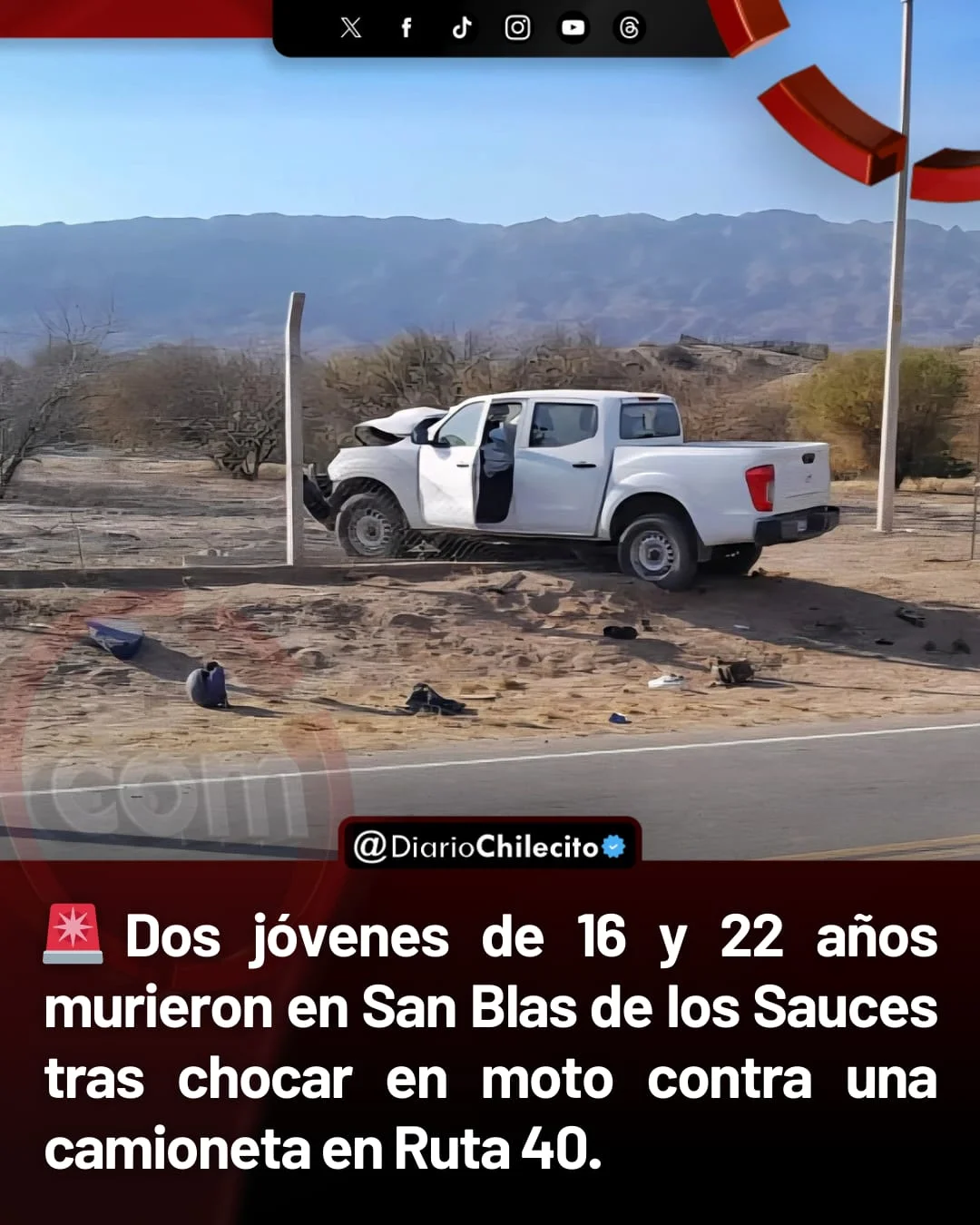 ● Un siniestro vial ocurrió este sábado a las 7.20 en la Ruta Nacional 40, a la altura de Chaupihuasi (San Blas de los Sauces). Una moto en la que viajaban dos jóvenes de Salicas chocó contra una camioneta Nissan Frontier que circulaba en sentido contrario.