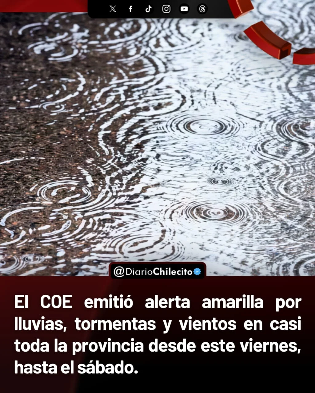 ● El Comité Operativo de Emergencia activó una alerta amarilla por lluvias, tormentas y vientos para la mayor parte de la provincia de La Rioja. El aviso rige desde la noche de este viernes hasta la mañana del sábado, según informó el Sistema Integrado de Alerta Temprana (SIAT).