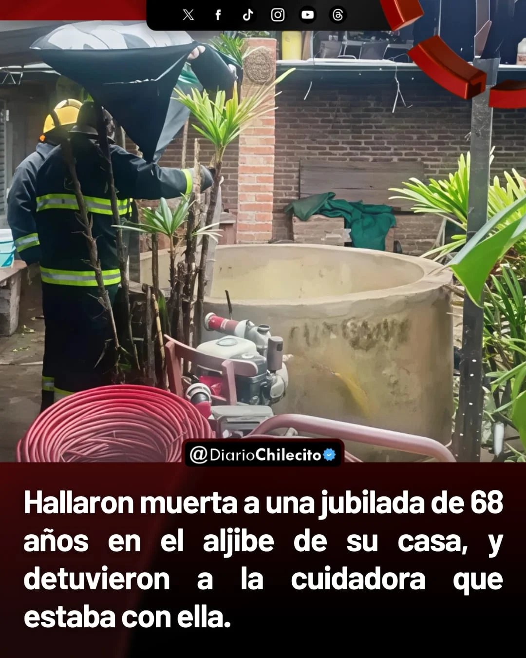 ● Una mujer de 68 años, identificada como Mirta Córdoba, fue encontrada sin vida en el aljibe de su casa. El hecho generó conmoción porque la jubilada vivía acompañada y dependía de la asistencia de una cuidadora.