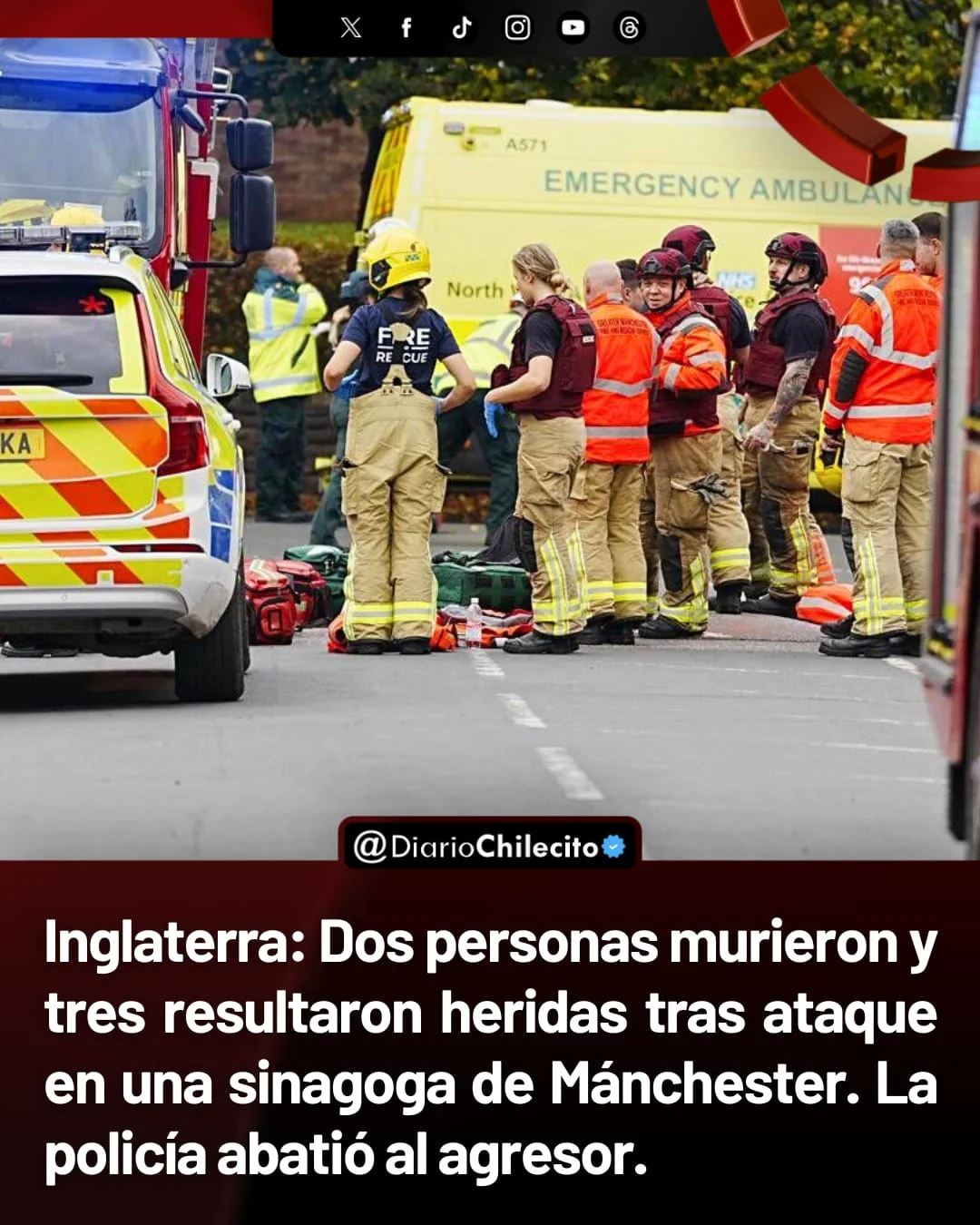 ● Un ataque frente a una sinagoga en el norte de Mánchester dejó dos muertos y tres heridos graves. El hecho ocurrió en Yom Kipur, la fecha más sagrada para la comunidad judía, cuando el templo estaba lleno de familias.