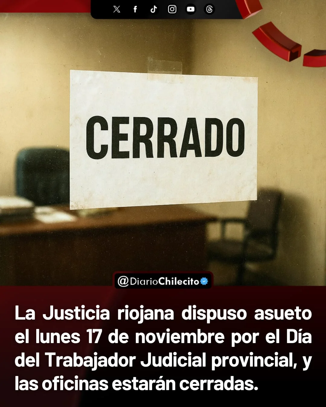 ● El Poder Judicial de la Provincia anunció que el lunes 17 de noviembre habrá asueto por el Día del Trabajador Judicial. La medida afecta a todas las dependencias y busca reconocer la tarea diaria de quienes sostienen el servicio.