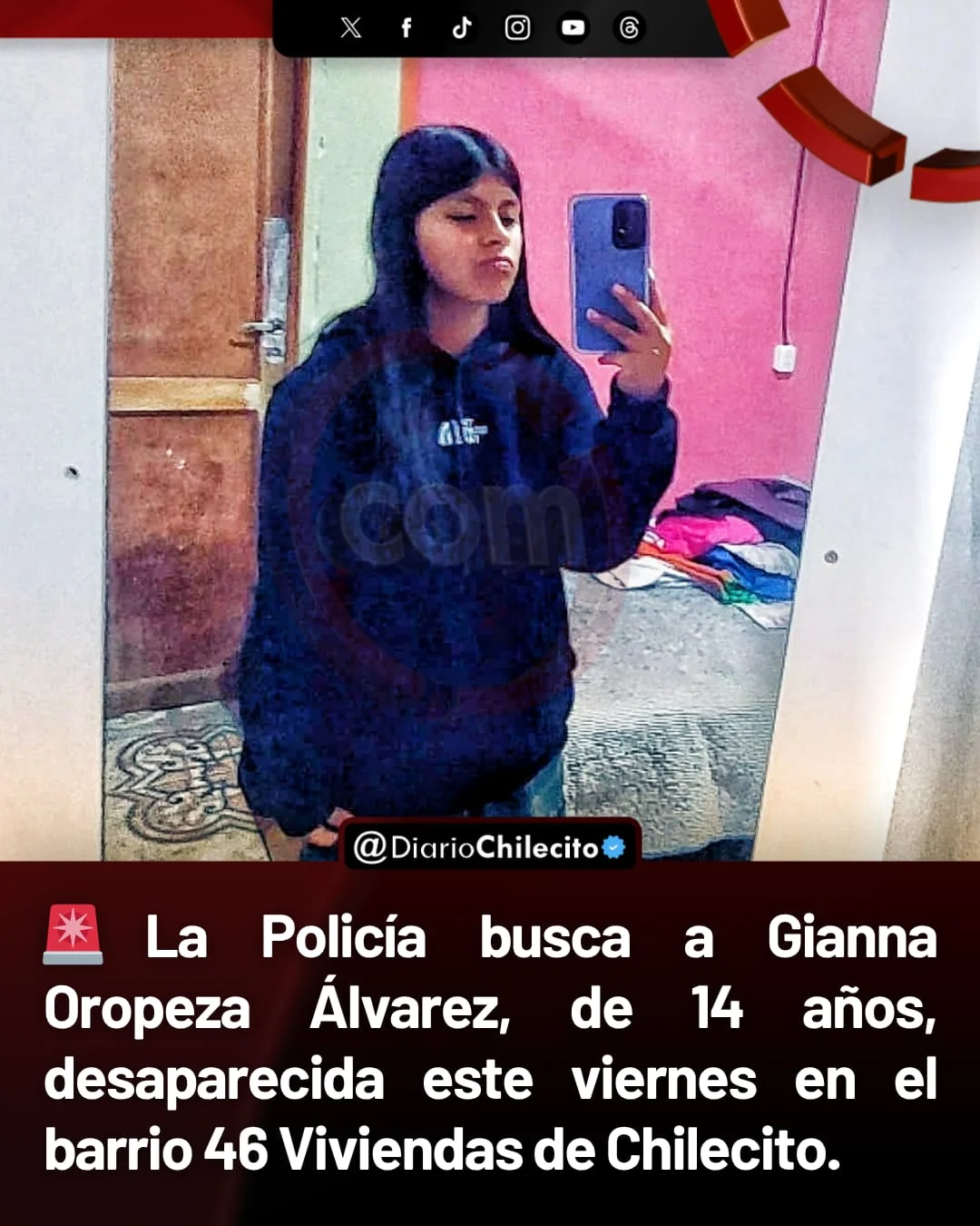 ● La Unidad Especial de Atención a la Mujer, Minoridad y Familia de Chilecito busca a Gianna Esperanza Oropeza Álvarez, de 14 años, quien se fue de su casa este viernes a las 17:30 y hasta el momento no regresó. Su mamá, Cristina Gallardo Álvarez, hizo la denuncia y pidió ayuda para dar con su paradero.