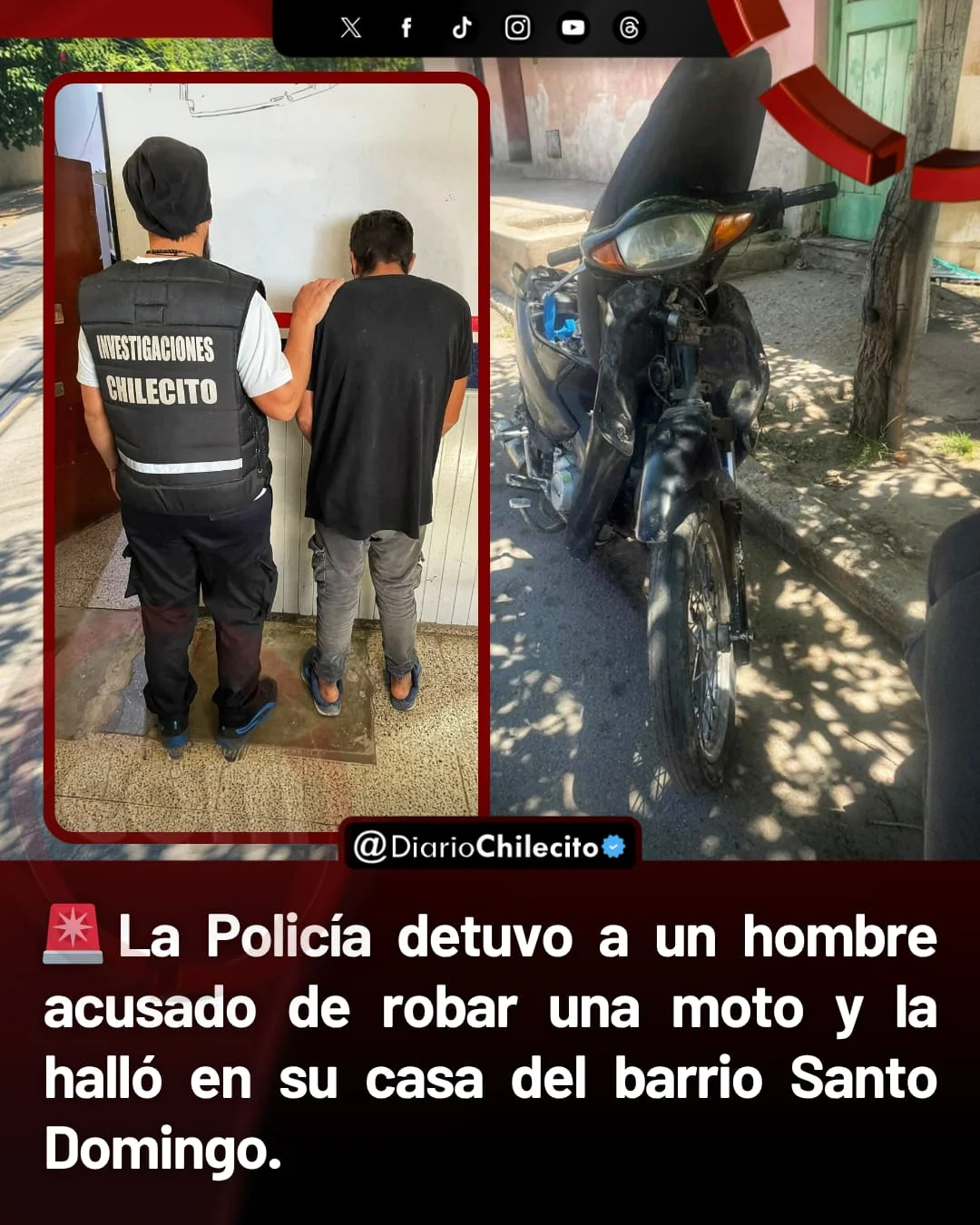 ● La Policía de Investigaciones de Chilecito detuvo este domingo a un joven de 30 años y recuperó una moto robada el mismo día. El operativo se realizó cerca de las 14 en una vivienda del barrio Santo Domingo.