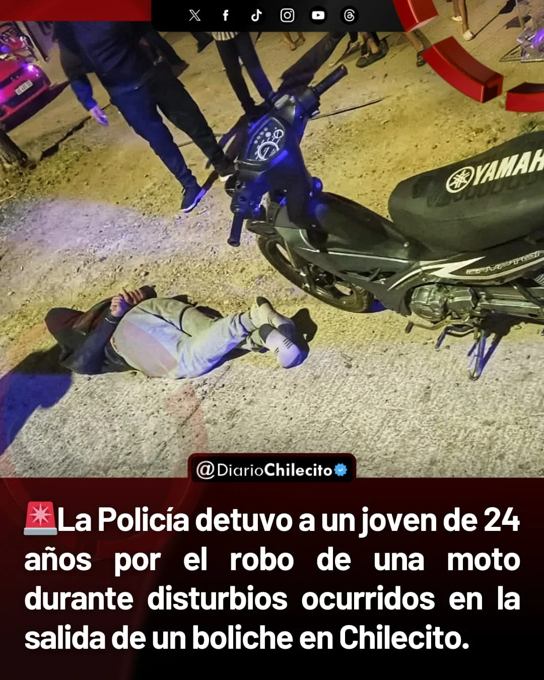 ● A unos 150 metros del boliche, efectivos que realizaban adicionales encontraron a un grupo que huyó al advertir la presencia policial. En el lugar quedó un joven junto a una motocicleta Yamaha Crypton, color gris con negro, que había sido reportada como robada instantes antes.