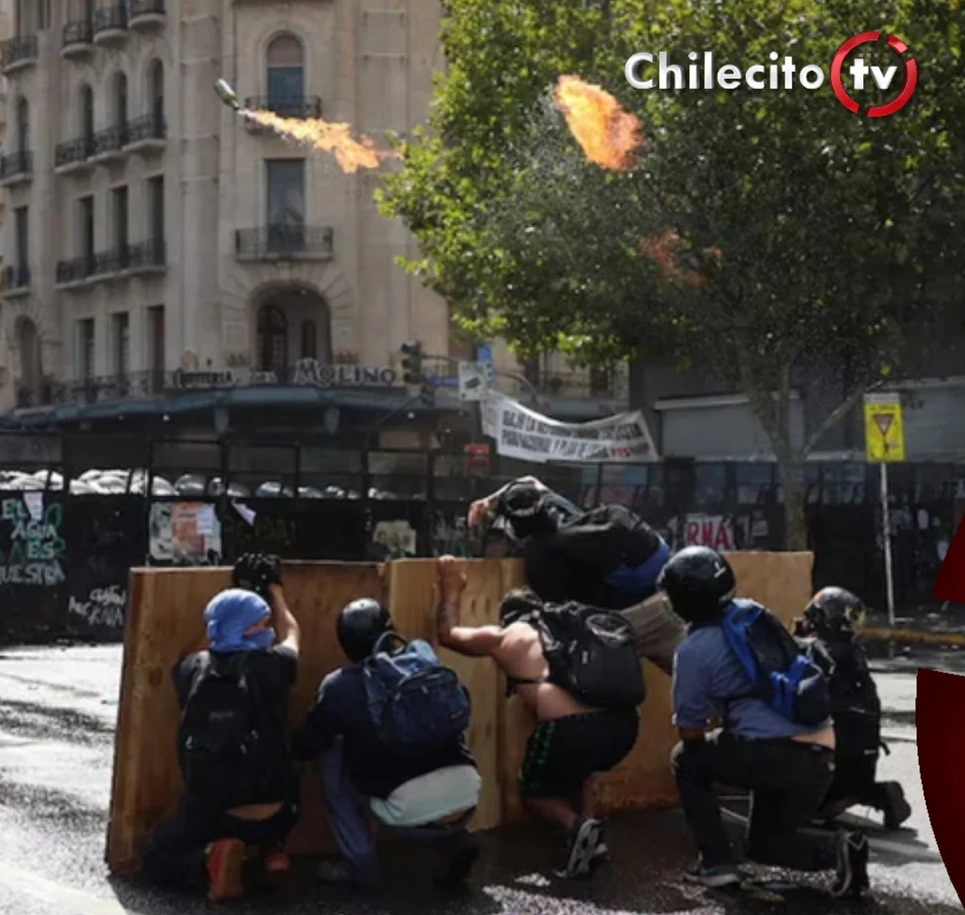 En la misma secuencia se advierte el lanzamiento de al menos cuatro botellas incendiarias, identificadas como bombas molotov, que impactaron en la zona donde se encontraban los efectivos. También se observa la intervención de un camión hidrante de la Policía, que actuó para dispersar y apagar los focos de incendio generados por los artefactos.