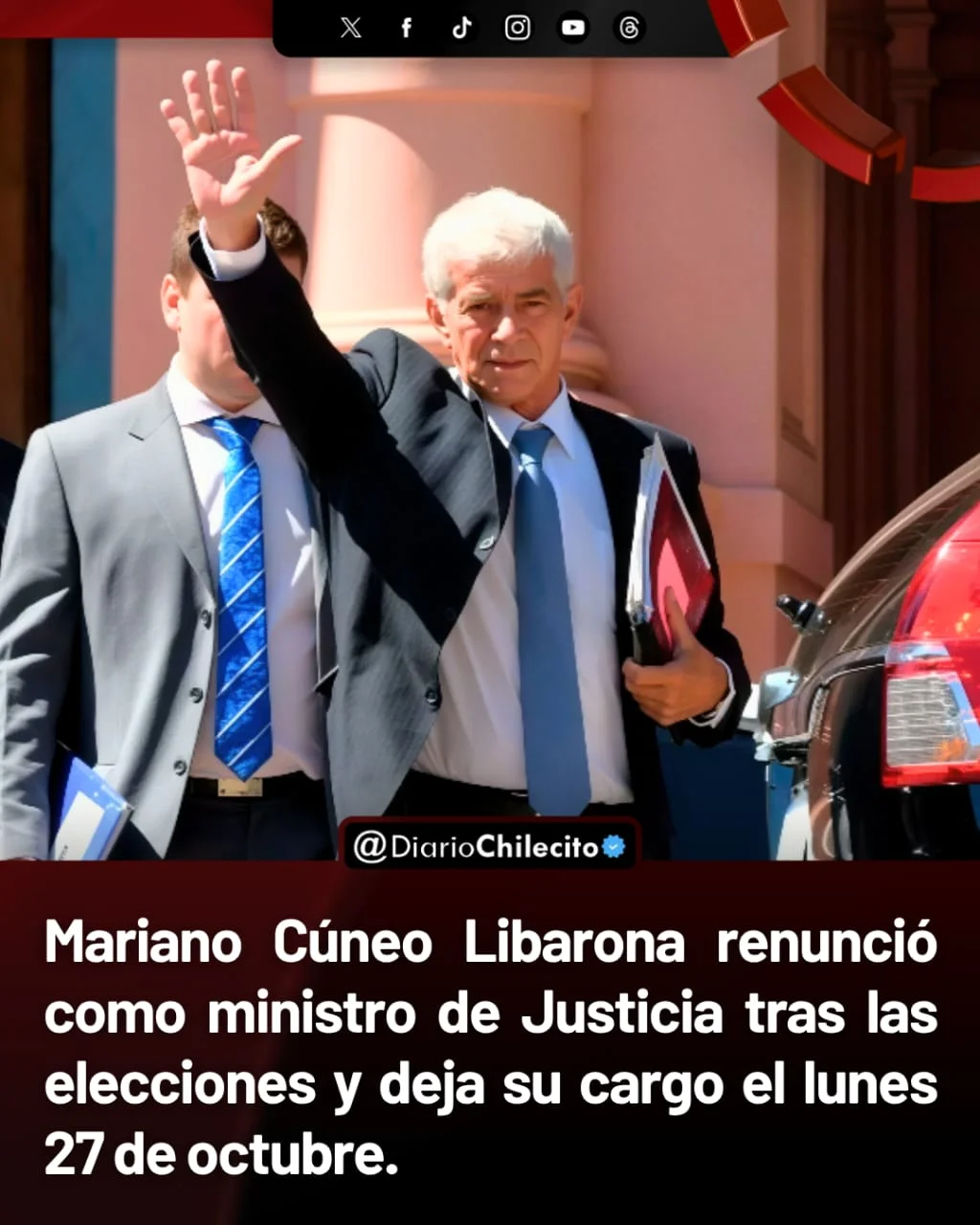 ● Mariano Cúneo Libarona anunció que deja su puesto como ministro de Justicia de la Nación, formalizando la renuncia el lunes 27 de octubre. La decisión llega justo después de las elecciones y despierta preguntas sobre cómo se reorganizará el área mientras la gente sigue necesitando respuestas concretas.