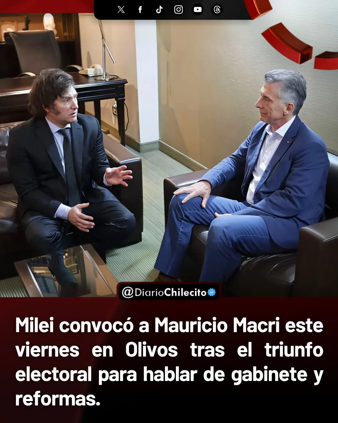 ● Tras el contundente triunfo electoral del pasado domingo, el presidente Javier Milei fijó para este viernes en la Quinta de Olivos un encuentro con el expresidente Mauricio Macri. El objetivo: definir cómo se va a ordenar el gabinete y cómo dar paso a la agenda de reformas que el oficialismo quiere impulsar.