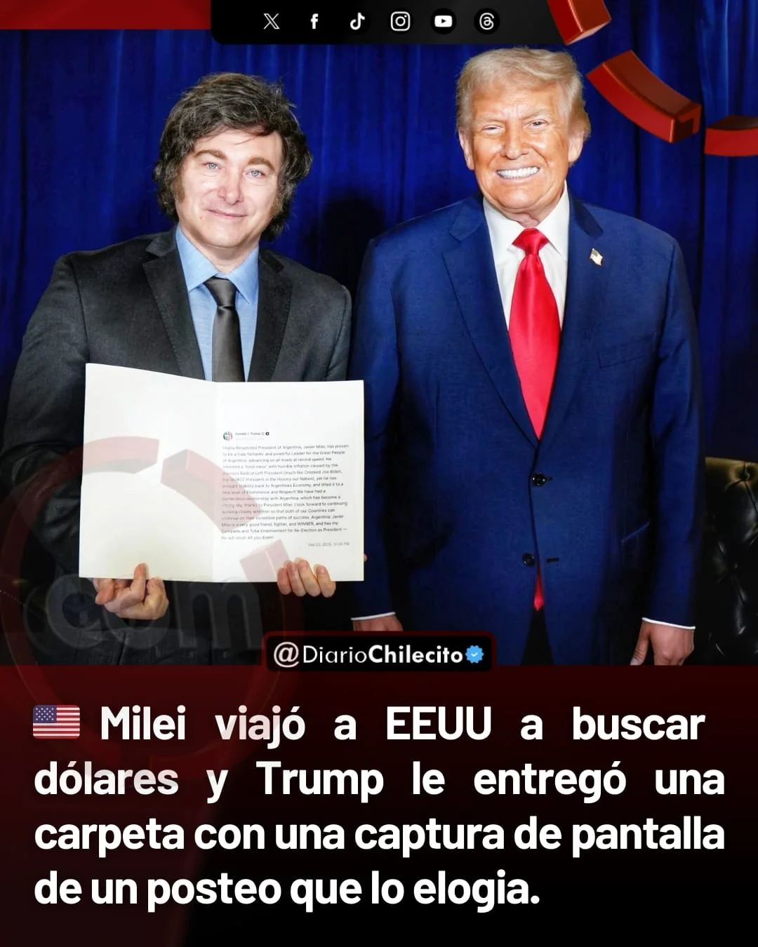● En Nueva York, la escena fue tan llamativa como incómoda: Javier Milei llegó buscando respaldo financiero y se llevó una carpeta con palabras que le fortalecen el ego. Dentro había una captura de pantalla impresa del posteo que Donald Trump publicó en su red social, donde lo elogiaba como presidente y lo señalaba como candidato a continuar en el poder.
