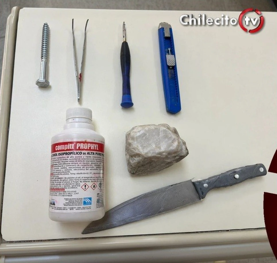 Según informó el comisario Abel Guzmán, por orden de la jueza subrogante de Instrucción en lo Criminal y Correccional N° 1, doctora Alfonso, se efectuó la requisa de la mochila del joven en presencia de testigos. En el procedimiento se secuestró un cuchillo tipo carnicero de aproximadamente 30 centímetros, además de un destornillador, tornillos, una piedra y un producto de limpieza para componentes electrónicos.