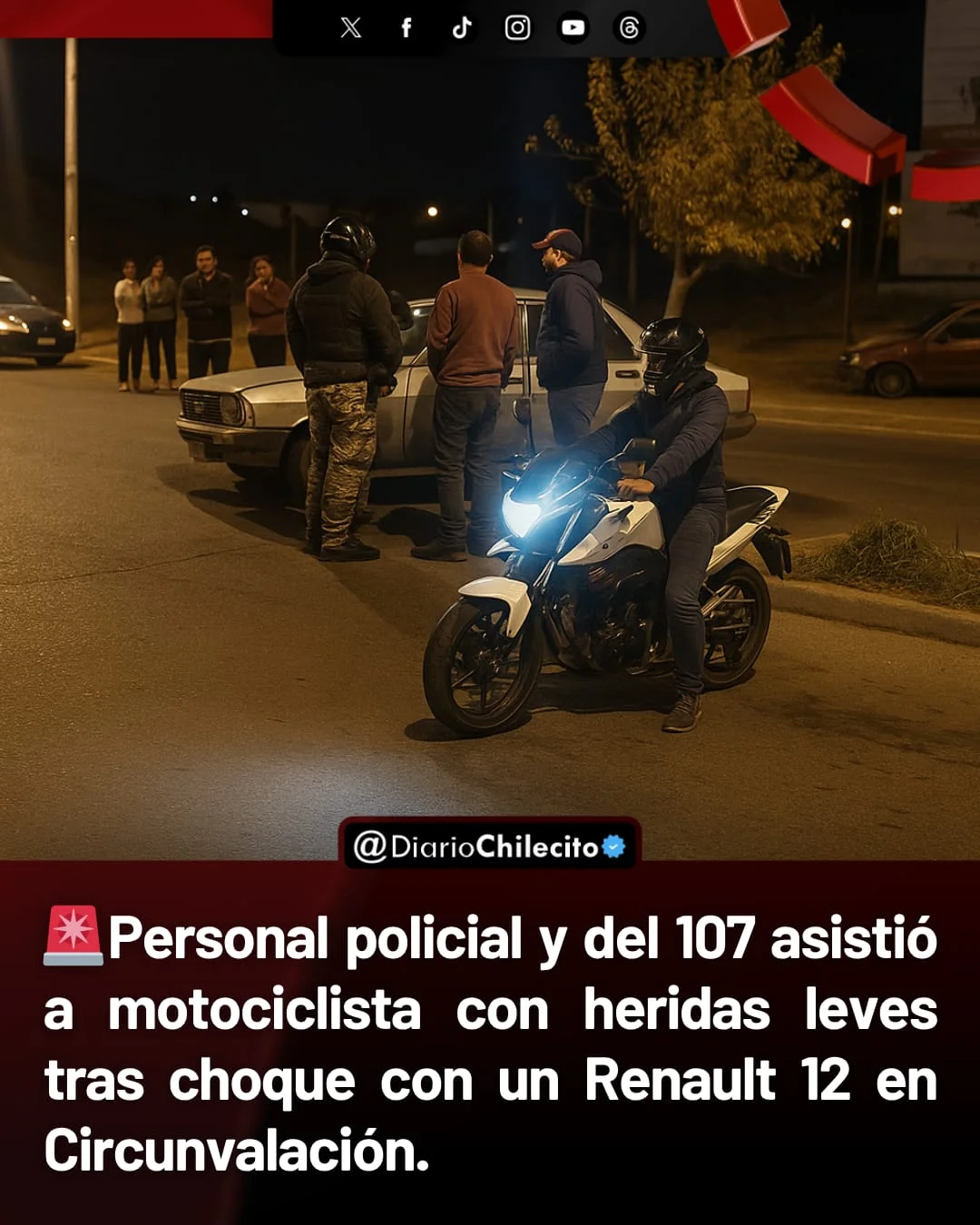 ● Un siniestro vial ocurrió este domingo a las 21:40 en Av. Circunvalación y calle 4 de Junio, en Chilecito. El choque involucró a un automóvil Renault 12, conducido por un hombre de apellido Rodríguez, de 42 años, y a una motocicleta 110 cc manejada por una joven de apellido Gaitán, de 18 años.