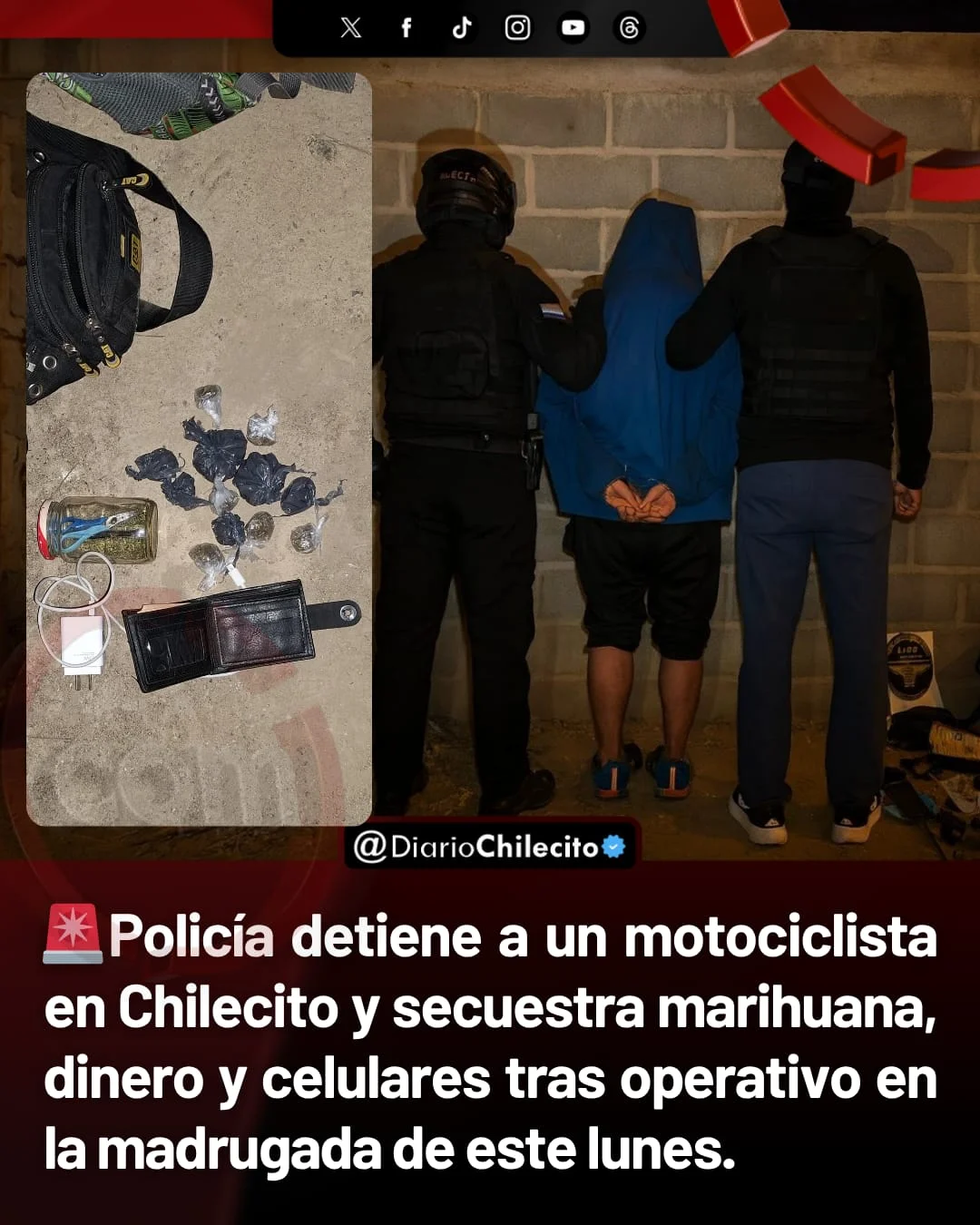 ● Según la prueba de campo, dio positivo para marihuana en un frasco y 12 envoltorios. También se incautaron $65.000, cinco dólares, dos celulares y la moto que utilizaba.