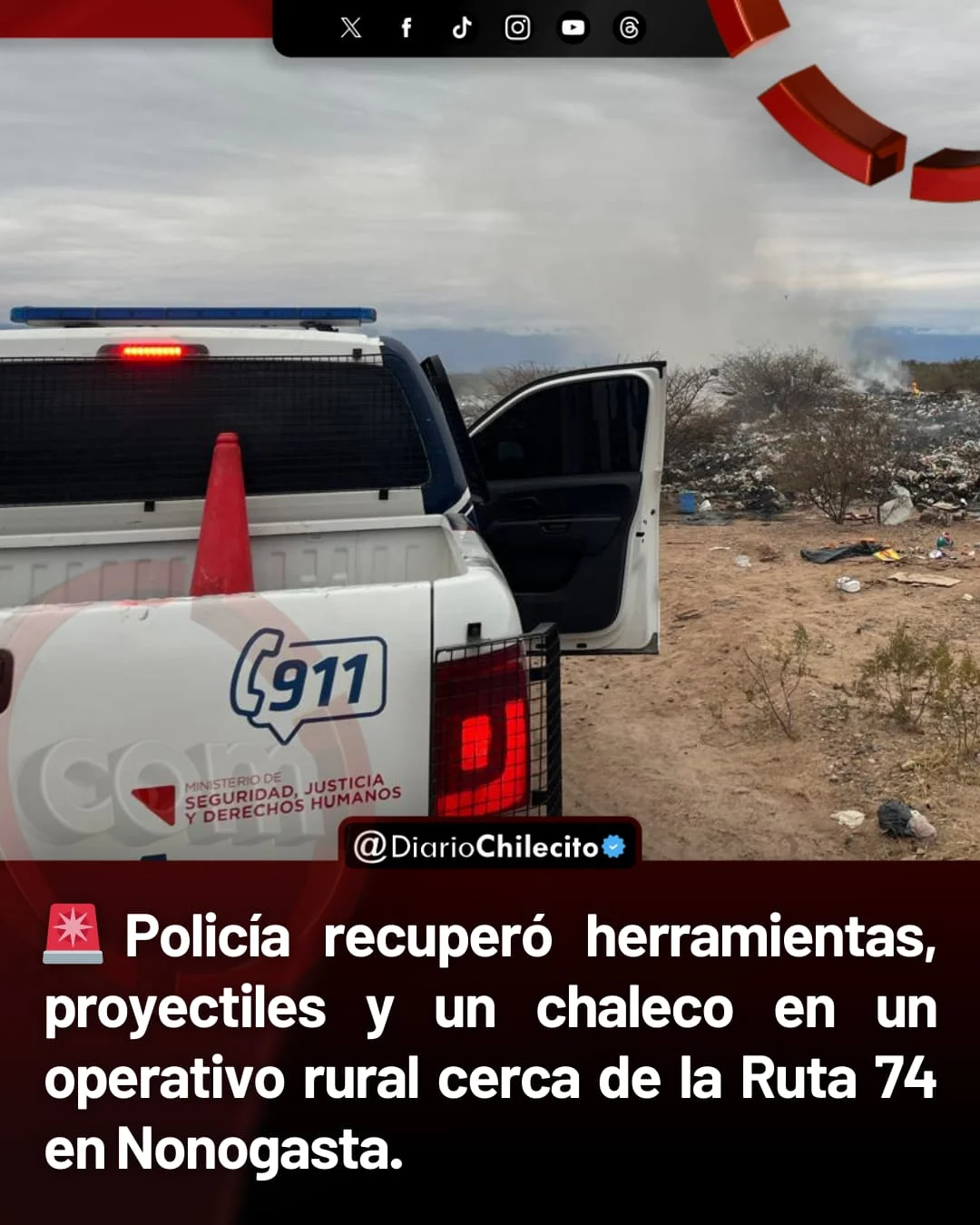● La Policía realizó un rastrillaje este viernes al mediodía en zona rural de Nonogasta, cerca de la Ruta 74. Allí recuperó una amoladora, proyectiles y un chaleco policial.