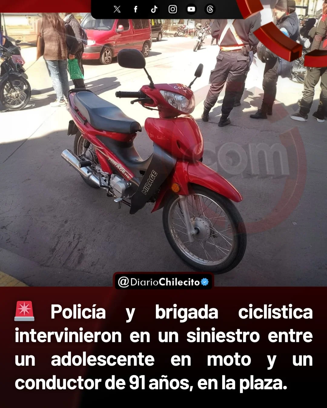 ● Un siniestro vial ocurrió este martes al mediodía en la intersección de calles 25 de Mayo y Castro Barros, en la ciudad de Chilecito. En el hecho se vieron involucrados un conductor de 91 años que circulaba en un utilitario y un adolescente de 16 años que manejaba una motocicleta.