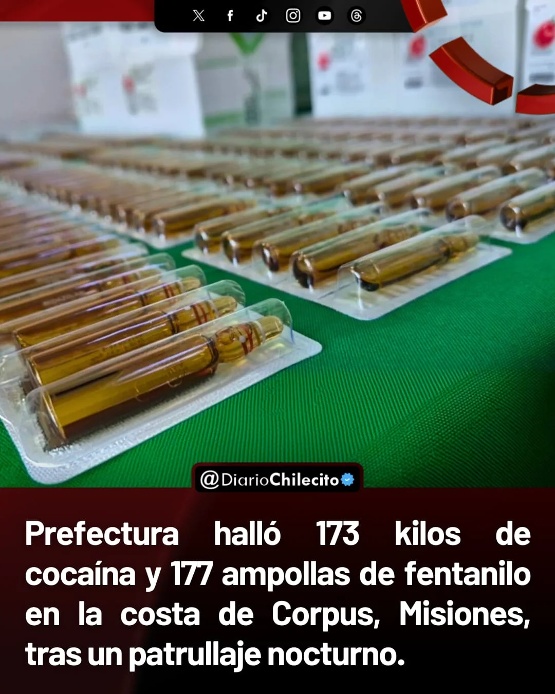 ● Prefectura Naval incautó un cargamento con más de 173 kilos de cocaína y ampollas de fentanilo en la ciudad de Corpus, Misiones. El hallazgo importa porque el fentanilo es una de las drogas más letales y generó crisis sanitarias en varios países.