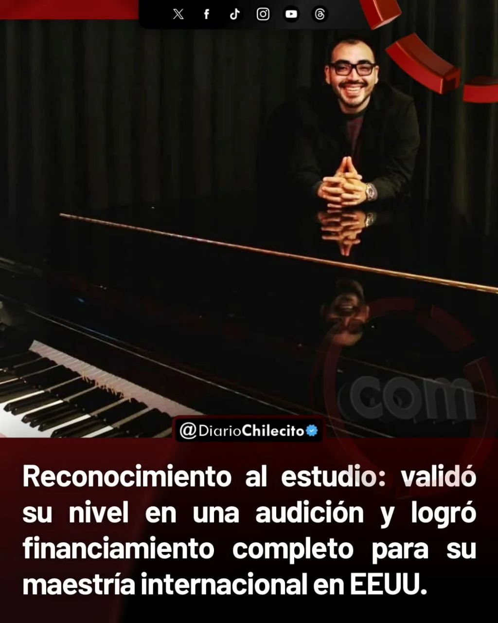 ● El reconocido pianista chileciteño, Cristian Peralta, comenzará una maestría en piano en la Universidad East Texas A&M en Estados Unidos, este 5 de enero, tras superar un exigente proceso de selección internacional. No se trata de suerte, sino de preparación: su admisión incluye una beca completa basada exclusivamente en su desempeño artístico y técnico frente al jurado académico.