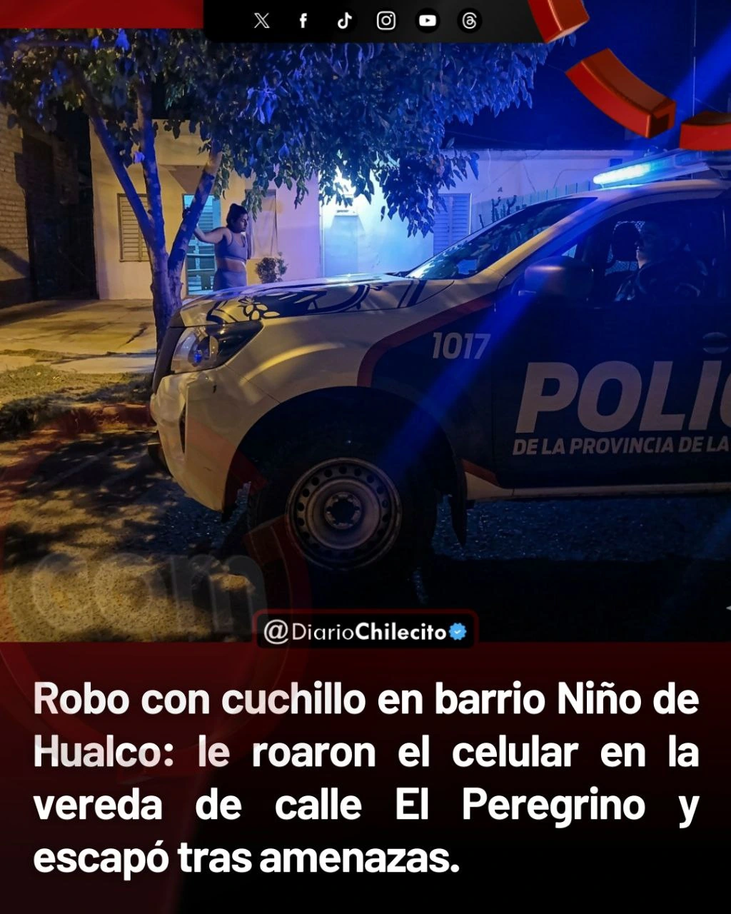 ● Una conversación en la vereda terminó con un robo y amenazas con cuchillo en calle El Peregrino, barrio Niño de Hualco. Un hombre denunció que otro individuo salió desde una vivienda cercana, le arrebató el teléfono celular y lo obligó a retirarse del lugar para resguardarse.