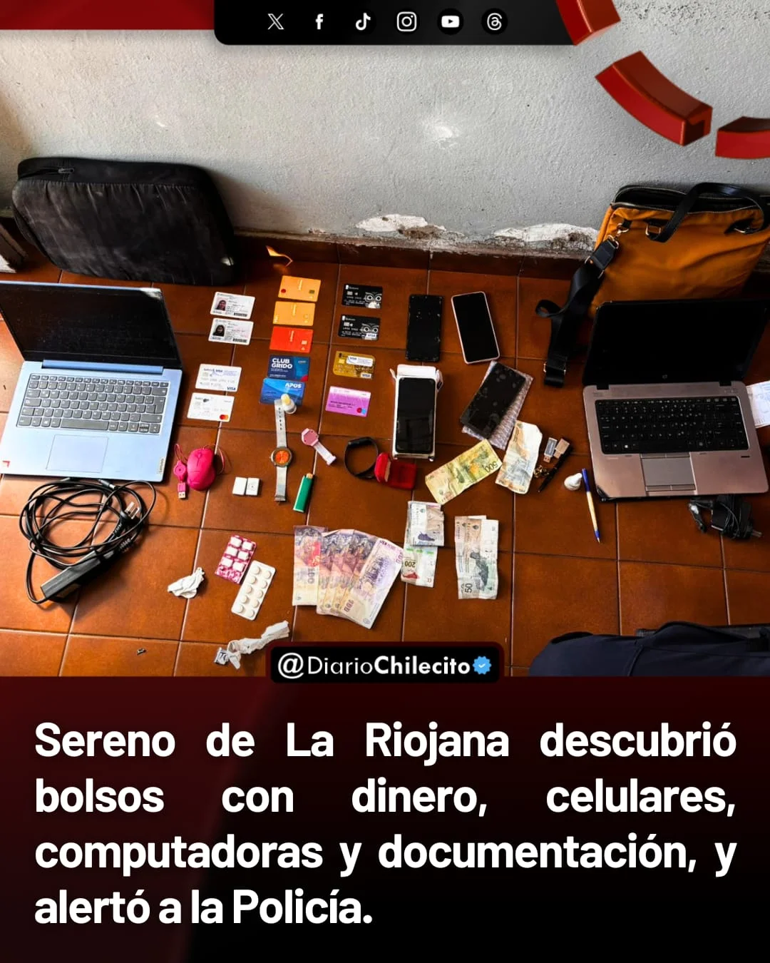 ● Este viernes a las 11:00, en la Bodega La Riojana de Calle Joaquín V. González, un sereno encontró dos bolsos con computadoras, celulares, dinero y tarjetas. La información fue derivada a la Comisaría Primera de Chilecito.