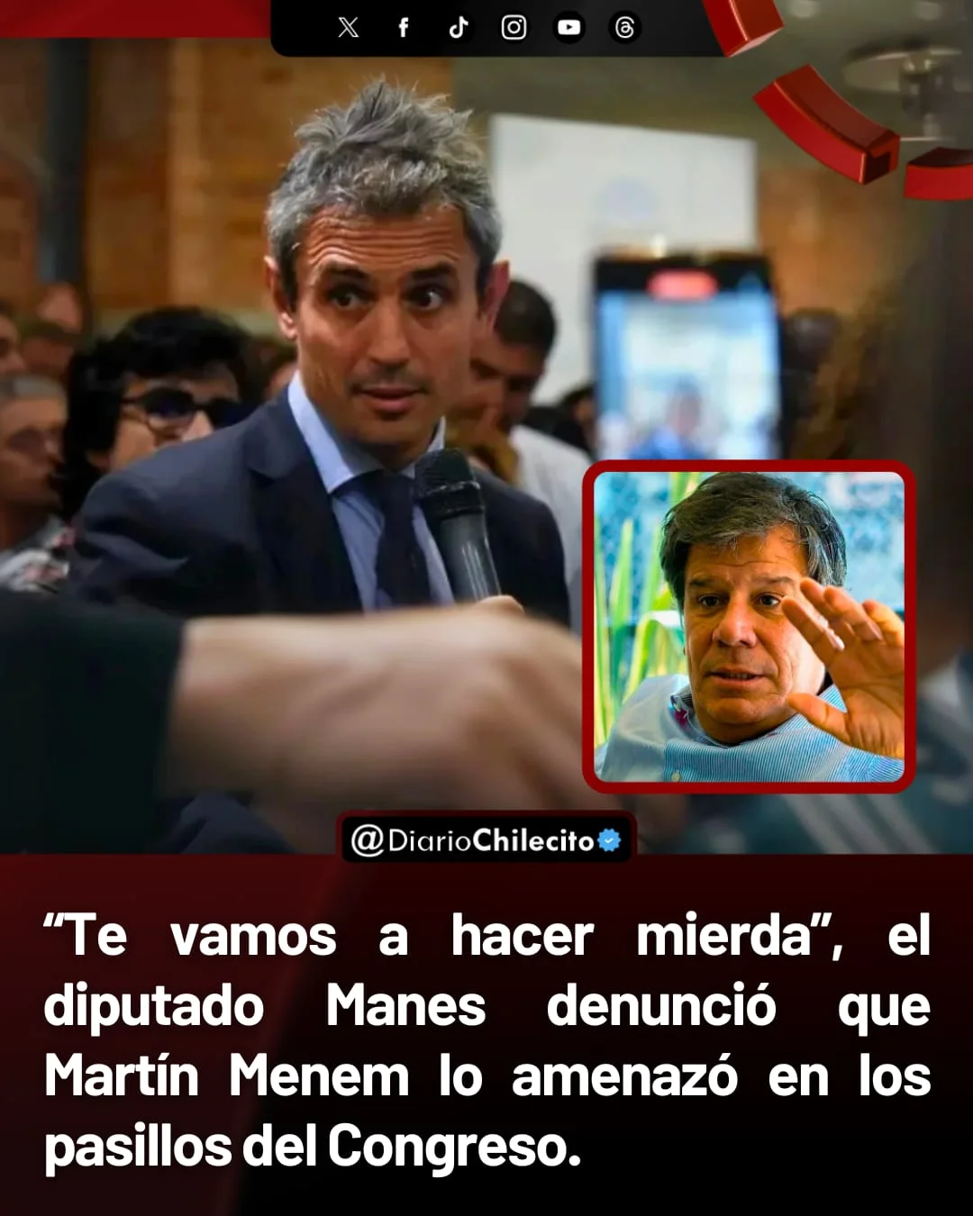● Manes compartió la denuncia en sus redes, calificando el episodio como “una muestra más de la violencia política que atraviesa el país”. Por su parte, Martín Menem negó haber proferido amenazas.
