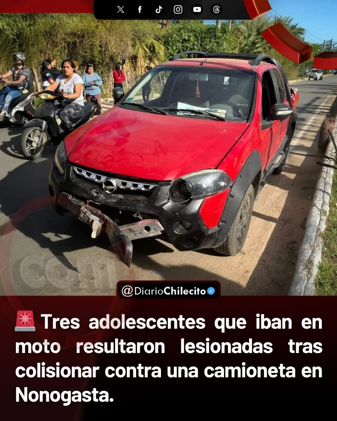 ● La camioneta era conducida por un hombre de 26 años que no sufrió lesiones, mientras que en la moto viajaban tres adolescentes de entre 13 y 15 años. Ninguna de ellas llevaba casco al momento del impacto.
