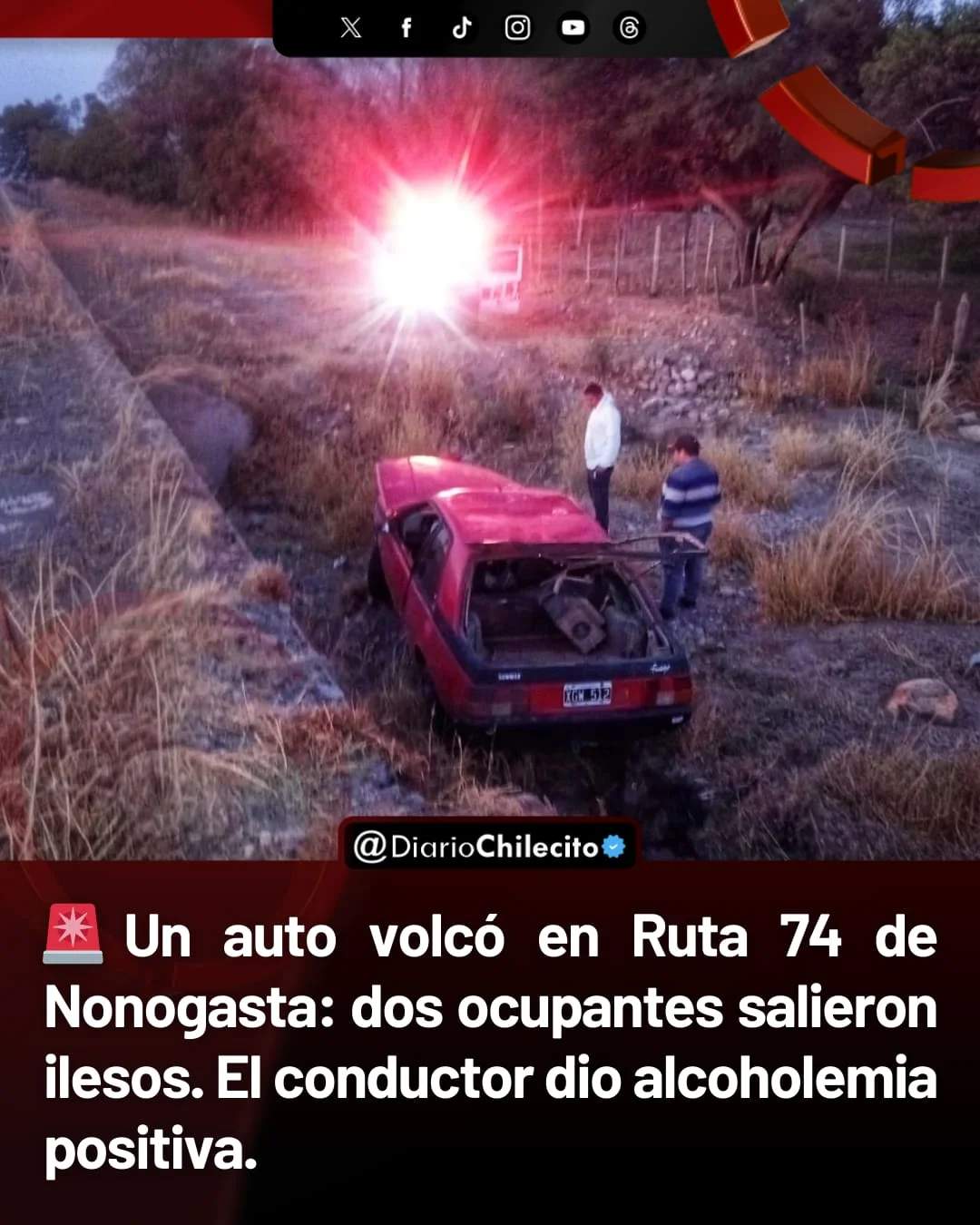 ● Un siniestro vial ocurrió este sábado a las 7 en la Ruta Nacional 74, a la altura de una empresa agropecuaria en Nonogasta. Un Renault Fuego rojo, en el que viajaban dos hombres de Vichigasta, volcó y quedó detenido en la banquina dentro de una alcantarilla.
