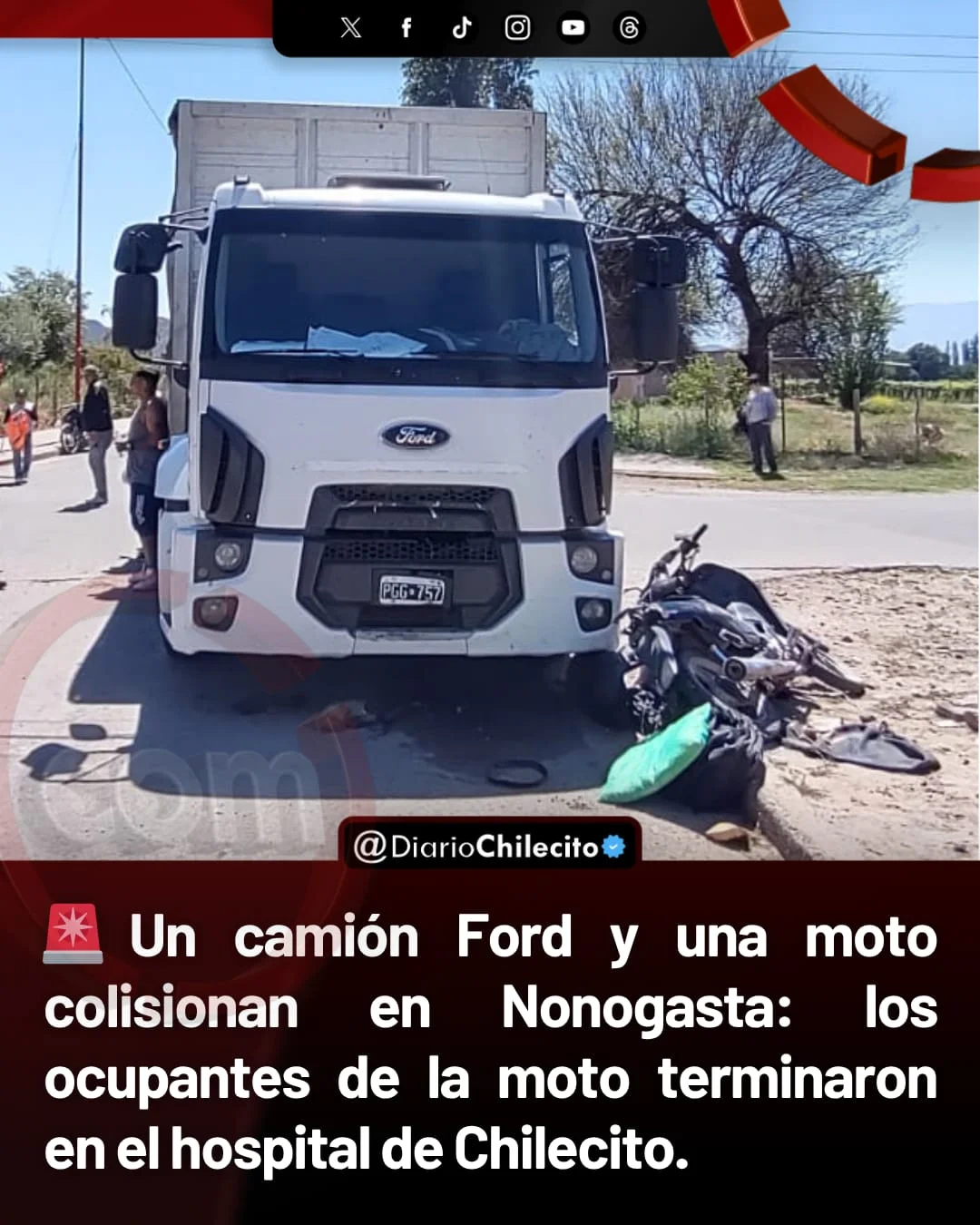 ● Un choque entre un camión y una moto dejó a dos jóvenes hospitalizados en Nonogasta. El accidente ocurrió este viernes al mediodía en la esquina de calle Gobernador Gordillo y San Martín, un cruce muy transitado del pueblo.