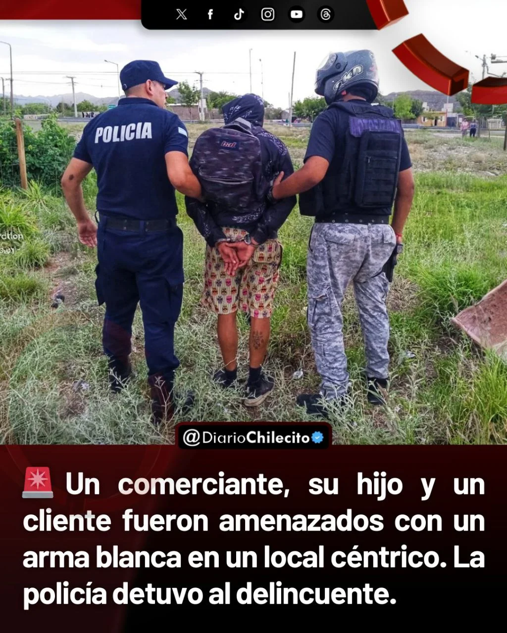 ● Un hombre de 32 años fue detenido en la tarde de este jueves en Chilecito, acusado de amenazar de muerte con un cuchillo y cometer un robo menor tras dos denuncias registradas con pocas horas de diferencia. El caso generó preocupación en una zona comercial muy transitada.
