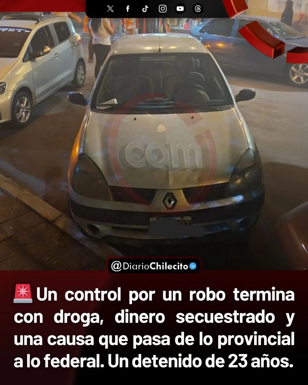 ● Un operativo judicial realizado en plena plaza principal de Chilecito terminó con la detención de un joven de 23 años, el secuestro de su automóvil y el hallazgo de dinero en efectivo que estaría relacionado con un hecho de hurto denunciado horas antes.