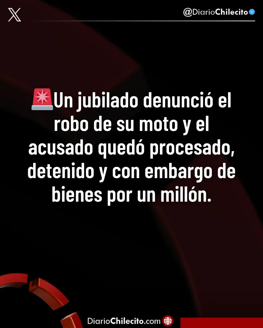 ● Un hombre de 72 años denunció el robo de su moto en una zona céntrica de Chilecito. El hecho ocurrió el 29 de noviembre de 2024 por la tarde, cuando la víctima dejó estacionado el rodado en avenida Arturo Illia y advirtió que había desaparecido al regresar media hora después.
