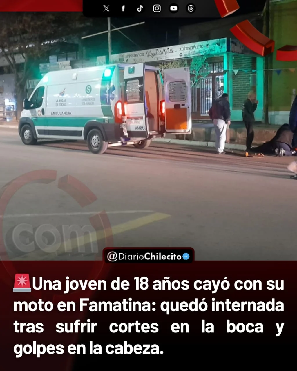● A las 6 de la mañana, una joven de 18 años resultó herida tras caer de su moto en calle Presidente Perón, frente al restaurante Viejo Capayán, en pleno centro de Famatina.