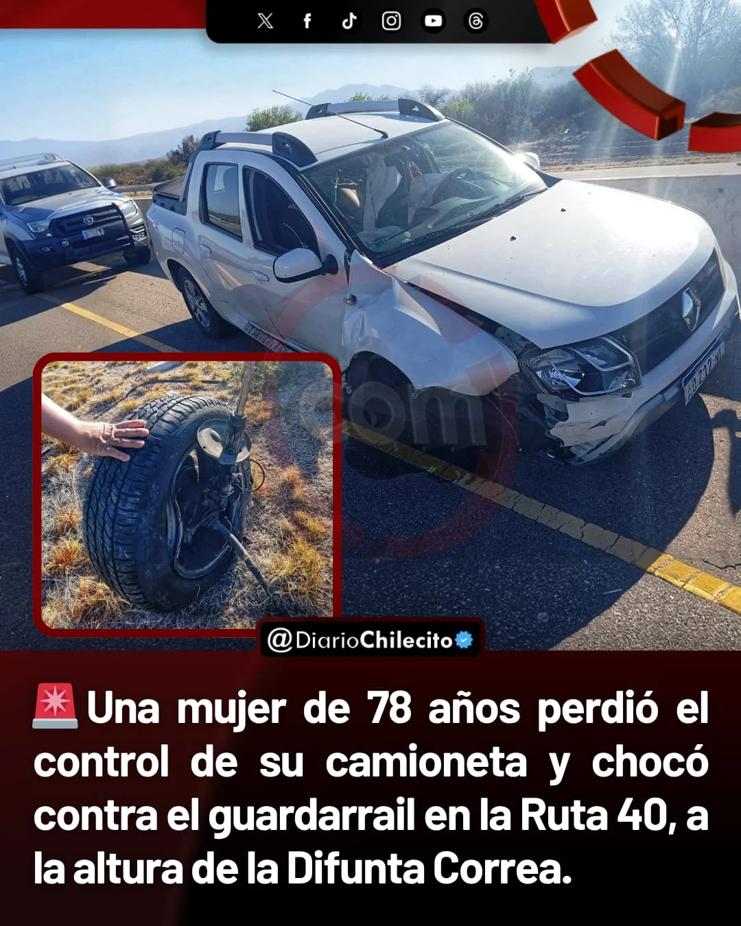 ● Una mujer de 78 años, de apellido Cerda, perdió el control de su camioneta Renault Oroch blanca y chocó este martes por la tarde contra el guardarrail en la Ruta Nacional 40, a la altura de la Difunta Correa, en Nonogasta.