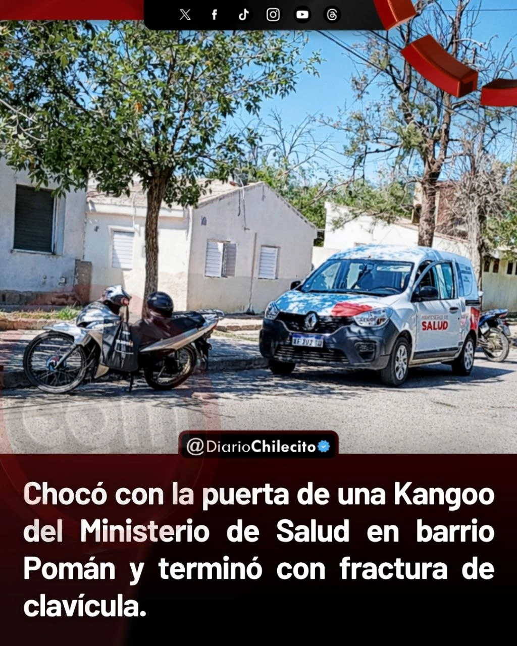 - Chocó con la puerta de una Kangoo del Ministerio de Salud en barrio Pomán y terminó con fractura de clavícula.
