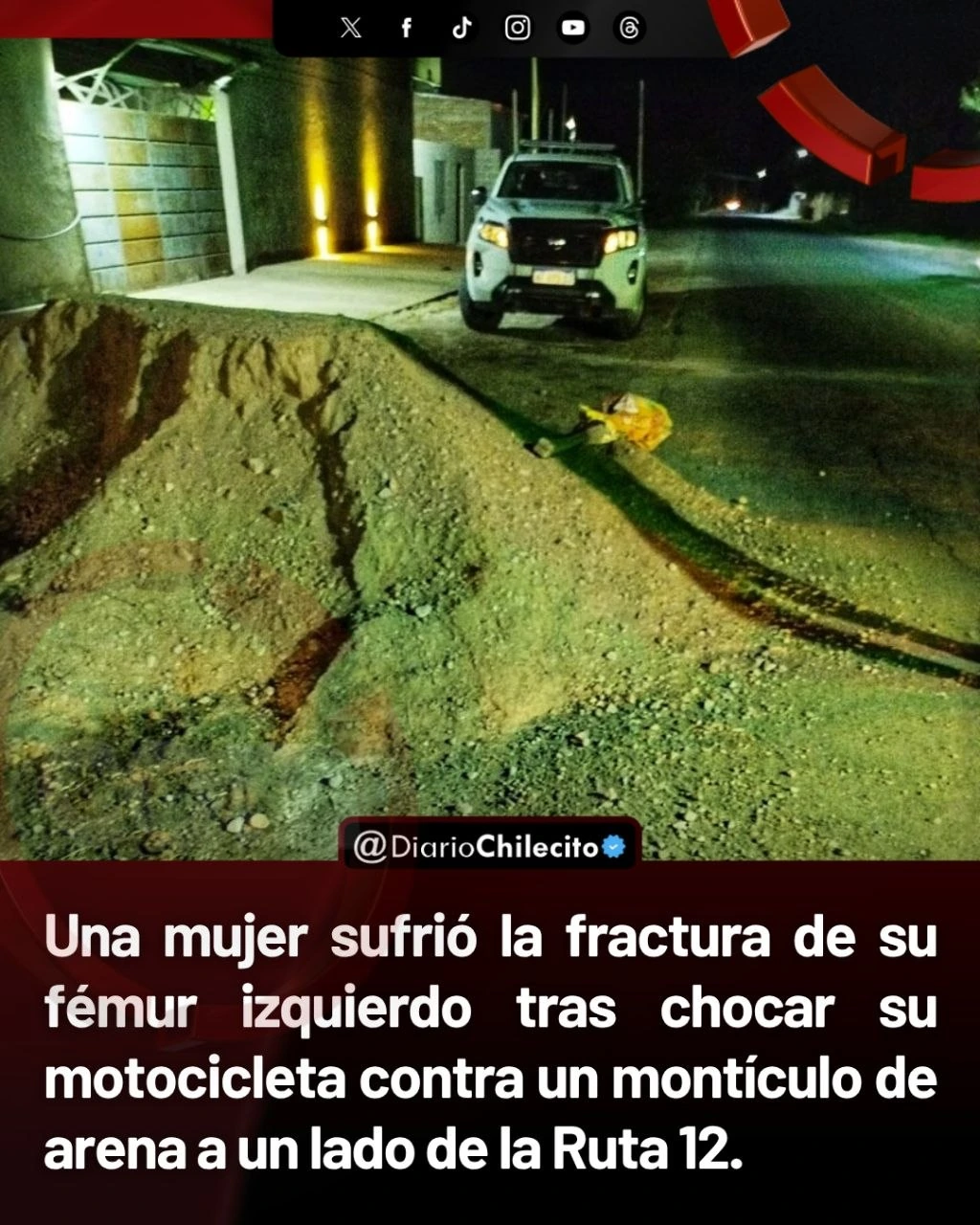 - Una mujer sufrió la fractura de su fémur izquierdo tras chocar su motocicleta contra un montículo de arena a un lado de la Ruta 12.